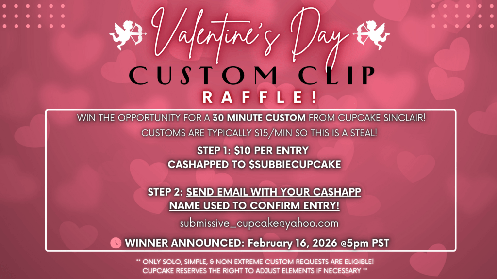 In honor of VDAY, I’m offering an extra sweet, super special CUSTOM CLIP RAFFLE opportunity! Until Feb. 16, entries have a chance for a 30 MIN CUSTOM. This prize is retailed at $450 so raffle is an absolute STEAL!